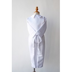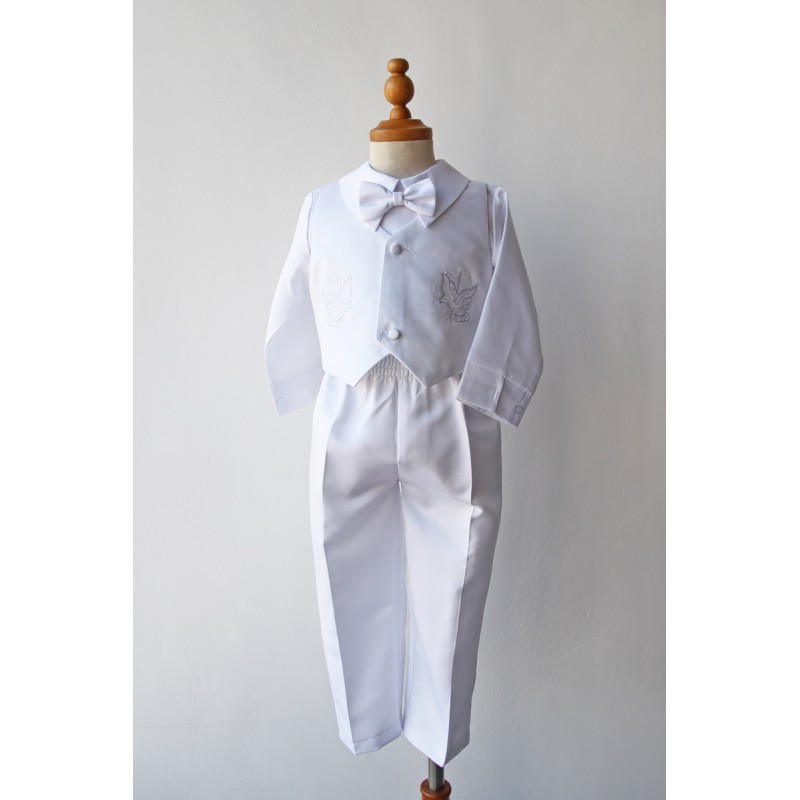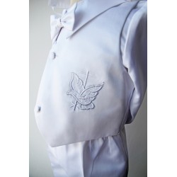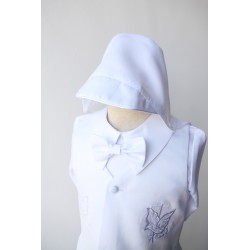 The 5 pieces outfit is made with 100% polyester satin. Vest front with holy cross embroidery. Elasticized pant, white satin shirt and sewn in bowtie, hat with ribbon ties.