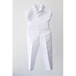 A handsome stand collar, back long tail, open front jacket with holy cross embroidery in the front, sewn in bowtie on pleated white shirt and goes with cummerbund at waist. White satin pant, pant is elasticized on all baby size